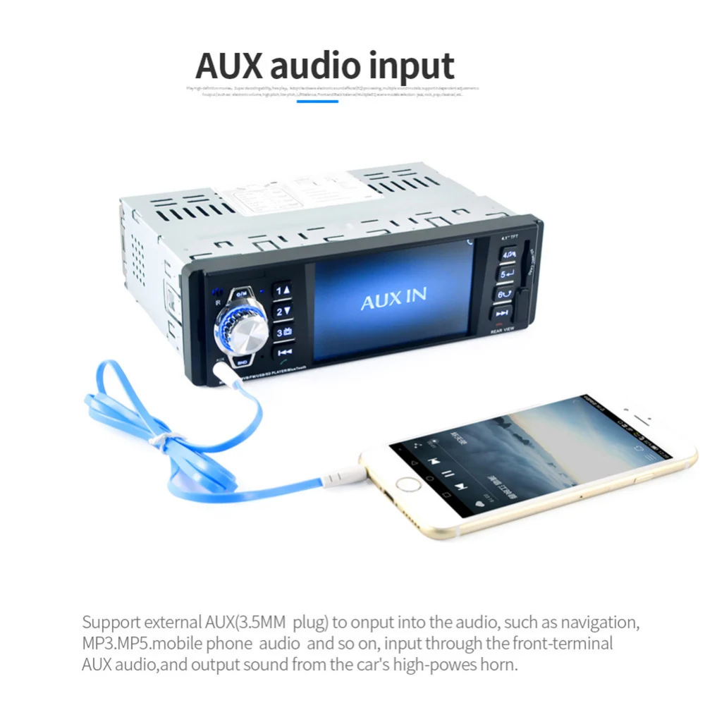 1Din Car Audio 4.1'' TFT HD Digital Stereo Viehcle FM Radios MP5 Player Video SD FM/USB Support Rear-view Camera Wheel Control As long as your cellphone can support blue tooth, you can answer your call through the front panel, and you can play the musics in your cellphone through blue tooth too. 4.1" full viewing angle high-definition TFT screen, so you can see the images on the screen when you are backing up. Colorful touch key lights, you can set your favorite light color to match the decoration in you car. You will like it. Features: FM radio with high-quality digital stereo, can search channels in several ways. 4.1 inch full viewing angle high-definition TFT screen. Support external AUX to output into the audio. Support USB 5V charging for cellphones. Multi-function IR remote control, mute control. Power-off with auto-memory store function under radio or SD/MMC/USB modes. Support memory card extension, including high-speed USB transmission. Colorful touch key lights, you can set your favorite light color to match the decoration in you car. Steering wheel remote control can bring you much more fun if you choose one. Easy and convenient to instal with the detail installation and operation muanual along with the product. Specifications: Model: 4016C Main material: plastic, metal OSD Language: English(default), Spanish, Portuguese, Russian, Italian, German, French, Polish Input voltage: DC12V SNR: 65dB Frequency response: 20Hz - 20KHz Loudspeaker impedance: 4 - 8Ω FM frequency: 87.5-108MHz Sensitivity: 25dB Selectivity: 60dB Separation: 35dB Music format: WAV, FLAC, MP3, APE, WMA, etc Viedio format: MPG, FLV, RMVB, Realplay, MOV, MPEG-4 AM frequency: 522KHz - 1620KHz Output power: 50W * 4 Input voltage: 12V Distortion: ≤ 0.3% Operating temperature: -20 ~ +60° MP5 player weight: 453.4g / 1.00lb Package weight without camera: 584g / 1.29lb Package weight with camera: 695g / 1.53lb Item size: 18.8 *12 * 5.8cm / 7.40 * 4.72 * 2.28in Package size: 21 * 18 * 8cm / 8.27 * 7.09 * 3.15in Package list: 1 * Car Stereo Audio MP5 Player 2 * Cable 1 * Remote Control 1 * User Manual 1 * Steering Wheel Remote Control (optional) 1 * Rear-view Camera (optional) Shipping: 1.We guarantee to ship goods out within 24-72 hour after payment confirmation except holiday. 2.We ship by China post,HKpost EMS,DHL,Fedex,according to your choice when placing orders . 3.If you didn't receive the item after 45 days,please feel free to contact us.We will make all our effort to resolve the problem. 4.We are not responsible for delays causedby the customs,Import duties,taxes or other customscharges. Warranty: 1.All items have 1 year guarantee.IF your purchase do not meet merchantable quality, fitness for purpose or match the description, We can make sure your issues are resolved . 2.For wrongly-shipped items, Please contact us in 48 hours after delivery.We will arrange to deliver the correct items or return all your payment. 3.For defective or faulty products,please take photos or videos,we would resend or refund after confirmation.