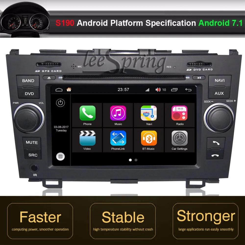 Android 7.1 Car DVD GPS Player for Honda CR-V >>S190 redefines the interactive interface with "concise,speedy,security,and intelligent"Clear function convenient for driver operation,and ensure safe and enjoyable car life. >>Based on original series products,S190 is more convenient for safe driving,UI interation,Practical function,interactive interaction,RK,4 core Corlex-A9 processor,equipped with high-definition large capacitive scree, user-friendly interface,Mirrorlink,Matched the Android 7.1 system,S190 perfectly combines car with people togeter >>Features: 1. CPU: RK, Cortex-A9 4 core processor 2. RAM 2G(DDR3) Flash 16G(eMMC) 2. Multi touch HD capacitive screen,maximum support 1080P high definition signal display 3. One second instant start 4. Mirror link function, double way operation >>Specification: CPU-----------------------Intel & RK, Cortex-A9 4 core processor Main frequency------------up 1.6GHz Memor---------------------32 mainstream ARM controllerSTM32F091VCTx QFP100 Touch Panel---------------Capacitive touch panel(G+G, Support 5 points touch) Radio---------------------ST7786M or NXP6686 DVD loader----------------Corpine 860MC DVD decoder---------------SPHE8288 Audio processing----------Rohm BD3702 Operating system----------Android 7.1