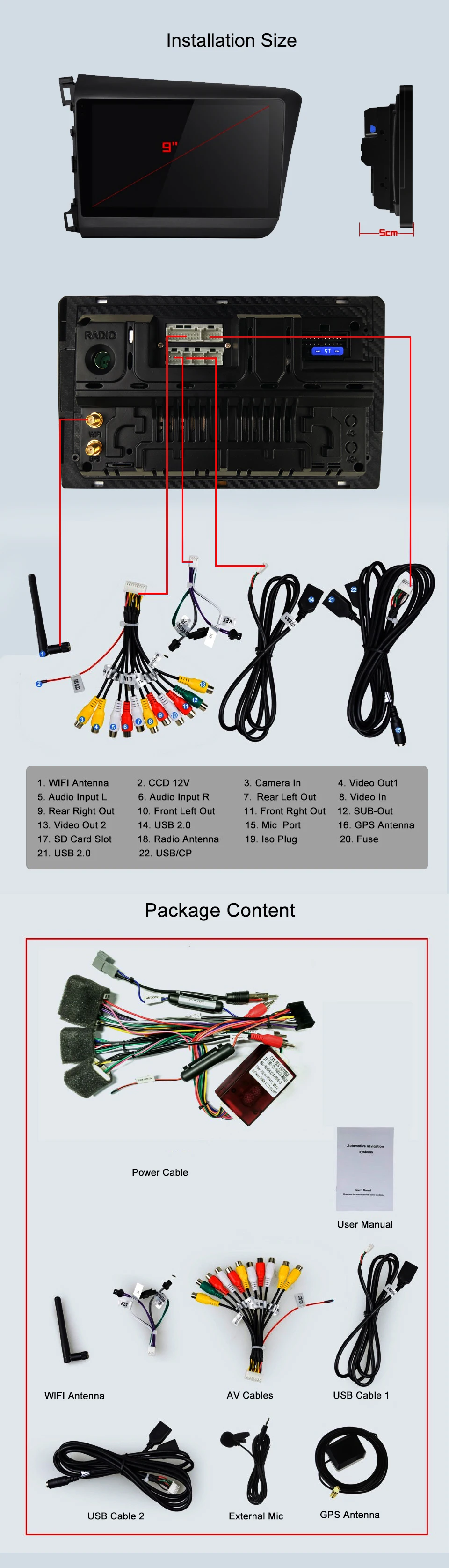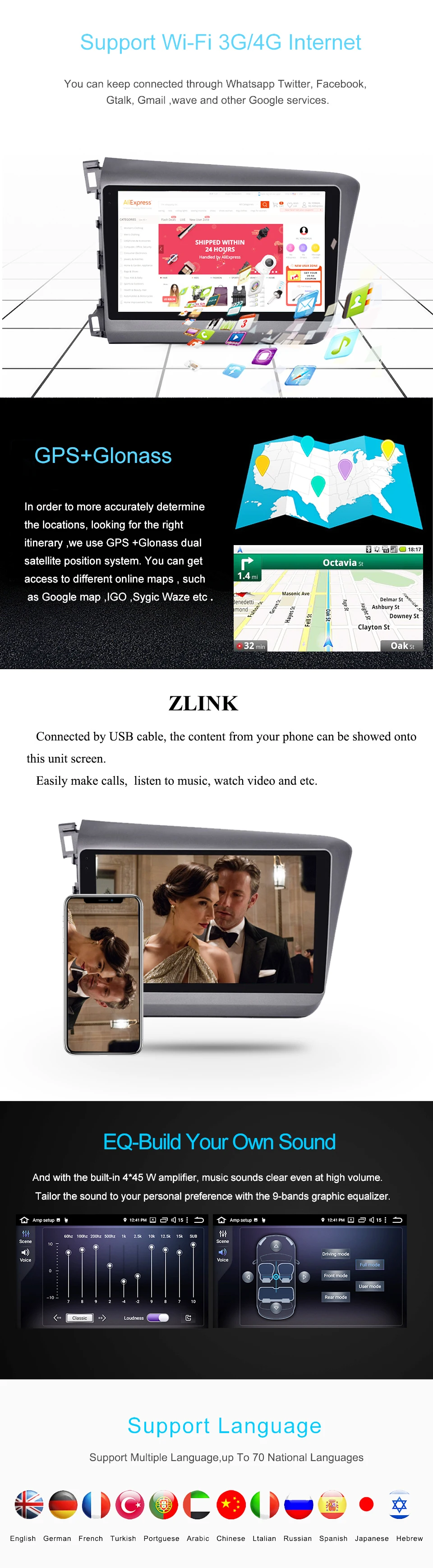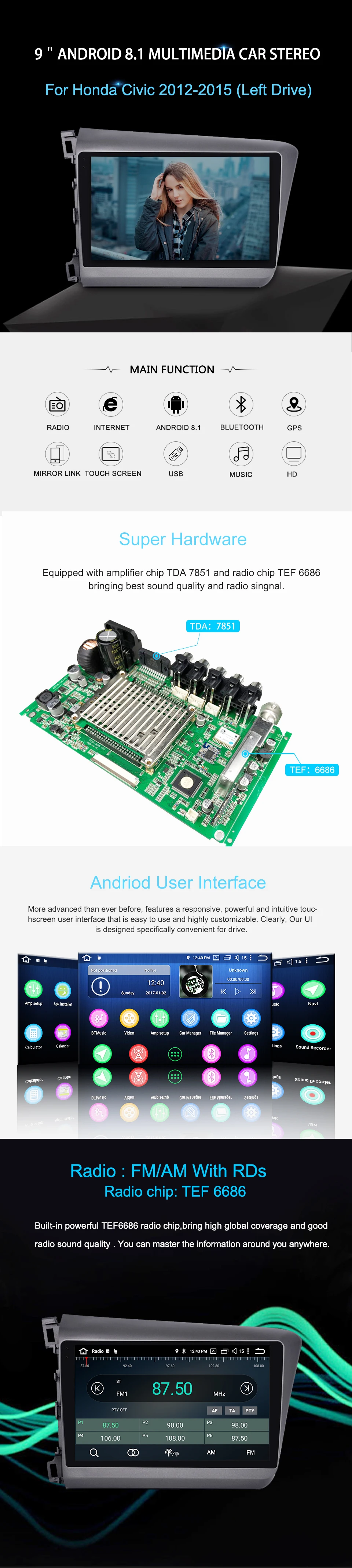 ARKRIGHT 9'' 2 Din Android 8.1 auto DVD player/car stereo GPS navis for Honda Civic 2012-2015 center mulitimedia 4gb+64gb DVR ARKRIGHT Car Radio for Honda Civic 2012-2015: CPU: PX5 Octa-Core64 bit Touch Screen size: 9 inch Din: Double Din RAM: DDR3 4GB ROM: 64 GB Radio Amplifier Chip: TEF 6686 Audio amplifier chip: TDA 7851 Screen Resolution: HD 1024*600 Bluetooth: 4.0 Speaker impedance: 4ohm Maximum power(front&rear): 45W x 4 Voltage: DC 12V 1. 9 inch HD car radio multimedia music player with capacitive touch screen. 2.Support Bluetooth hands-free calls,bluetooth music player. 3.Video input,can be connected with rear camera. 4.Video out, can connect headrest and external monitor by RCA video output. 5. Support ZLink, any content from IOS smartphone can be showed onto this unit screen. 6.Original Steering Wheel Control. Compatible with most of the steering wheel control functions. 7.1024*600 High Resolution, Multi-Touch screen. 8.Support Wi-Fi/3G/4G hot spot sharing, You can use What’sapp Twitter, Facebook, Gtalk, Gmail ,wave and other Google services. 9.Support GPS function and many kinds of GPS applications. E.g. Navitel,igo,here,waze and etc. 10. Support PIP, It can support the PIP function when you playing music and video and etc. 11.Support multiple languages-over 54 kinds of languages. 12. Built-in DSP. Note: ARKRIGHT head unit, do not support like below: iPod, original car GPS antenna, original car back up rear camera, original car bluetooth, original car USB as well original car Microphone. Please take care do not upgrade ROM from Malaysk on forum xda-developers or upgrade others brand app which not provide from ARKRIGHT. Because this kind of action will broken head unit. If you update it by self, you will face the issues like can't update yourmarshmallowanymore, and you will lost the service of head unit warranty. About shipping: 1.If there is customs taxes,buyers need to pay for it.If you have special request,please contact us when you make order. 2.Import duties, taxes and charges are not included in the item price or shipping charges. 3.Remote area fee excluded, for addresses listed in the Remote areas on DHL/Fedex website, will be charged an extra US$30 4.Usually we use DHL and EMS.if you can choose DHL we suggest you use it. if you prefer other express, please contact with us in time. Please give us your (mobile) phone number during checkout for shipping use, this is very important. All parcels will be sent within 1-3days usually upon receipt of payment (except weekend and festival) Installation : Please just install this unit by professional technician, also ask them to test it first before installation Before our sending, we have checked all our items carefully, if you received a broken defective item, just keep the original package and make a photo to us within 3 days Note: Installation Fees are out of our control, they must be paid by Buyer. The price includes no VAT and customs tax, if any fees happen, buyer should pay it by himself Buyer is responsible for shipping costs incurred shipping products back Warranty and return All our items are tested 4 times to ensure working properly before shipping and come with a 12-month Manufacture Warranty. The warranty will not cover damage from improper installation, accident, misuse, abuse, improper wiring, and incorrect voltage operating the unit against the instructions in the owner's manual. The validtime for replacement is 14 days from the date of receiving the item, if this item has any problem when arriving, please feel free to contact us and please note keep it in original condition. It is buyer's responsibility to pay for return postage and ship the item back to us. Please inform us of the reason of your order revocation and send us a clear picture or a video as a proof. Items returned to us without a report will not be processed.
